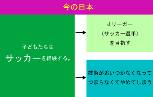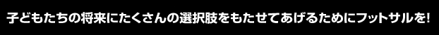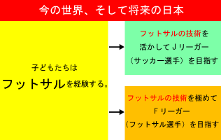 世界は子どもたちの今ではなく、大きくなったときに たくさんの選択肢をもたせてあげるために将来を 見すえてフットサルを経験させているのです。 それはプレーの選択の場面にも言えることですし、 選手としてフットサルに進むかサッカーに進む かという進路の選択の場面にも言えます。